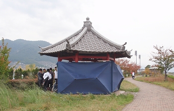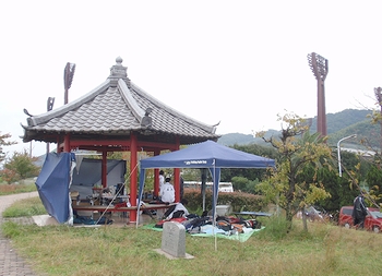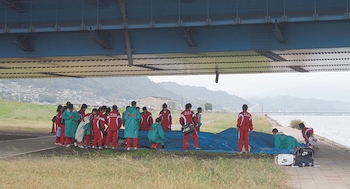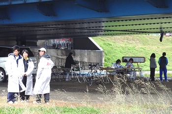 この日は、橋の下の河川敷でブルーのシートを敷いておられました高校生の皆様。