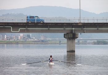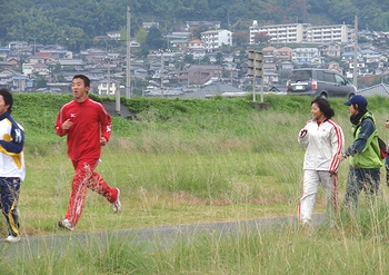 護岸ではコーチらしき方が、これもお二人、時折り何か指示しておられます。が、護岸を走りながらの指示・アドバイスですからコーチも大変ですネ(^.-)☆