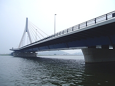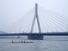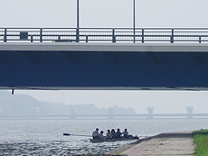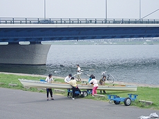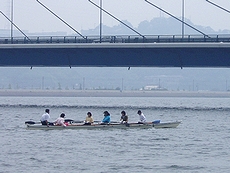芦田川大橋西詰め下まで戻って来ますと、嫁san達がレガッタの練習中。