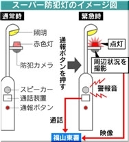 広島県は年内をめどに、緊急通報装置や防犯カメラを備えた「スーパー防犯灯」を、福山市中心部の10カ所に県内で初めて設置する。ひったくりや不審者による街頭犯罪を防ぎ、容疑者の早期摘発に役立てる。スーパー防犯灯は事件の被害者や目撃者が通報ボタンを押すと、通信回線を通じて福山東署の警察官と通話できる。警報音が鳴って赤色灯が点滅し、周囲に異常を伝える。同時に内蔵の防犯カメラが作動する。