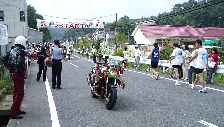 ブドウで装飾されまして、楽しいですねぇ(^-^)/井原市青野町はブドウの産地ですから、20km部門の給水ポイント5ヶ所ではブドウも準備してありまして沢山頂けました。