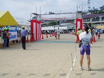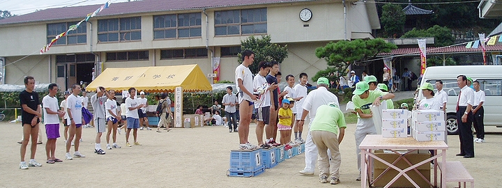 外は小雨が降っています様子で、このため一層よく眠れましたのかも(^.-)☆朝食を取りながら朝刊に眼を通していますと、昨日のマラソン、早速、中国新聞に掲載がありましたネ(^.-)☆《ブドウ畑駆ける 井原でマラソン》--- 2005/09/19 中国新聞 ---ブドウの産地、井原市青野地区を舞台に十八日、「ぶどうの里ふれあいマラソン」(青野公民館主催)があった。青野小を発着にする二十キロと五キロのコースに、十八都府県から三〜九十二歳の七百六十九人がエントリー。高低差百五十メートルのアップダウンの激しいコースに挑んだ。号砲を合図に、二十キロと五キロの参加ランナーたちが順次スタート。秋晴れの強い日差しの中、たわわに実ったブドウ畑の間を、汗を光らせながら駆け抜けて行った。沿道では住民たちが盛んに声援を送っていた。ゴールした参加者には、地元の生産者が提供した食べ放題のブドウが振る舞われた。五キロコースを完走した岡本恵里さん(27)=岡山市=は「きつかったけど、走り終わった後のブドウは最高ですね」と、おいしそうにほおばっていた。十四回目となる同マラソンは、住民ら約二百人が運営に協力し開かれている。各部門の1位記録と上位入賞者は次の通り。(敬称略)■20`--- 男子44歳以下 ---
