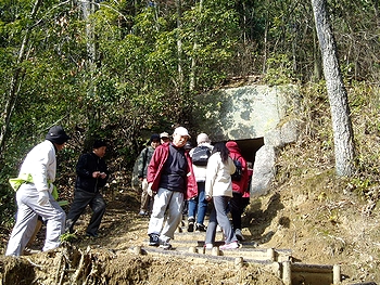 こり石室の特徴は、花崗岩の表面を磨いたような石材を使用していること、玄室と羨道がほぼ同じ規模で設計されていることが上げられます。また、玄室が床面の中央に置かれた二個の石によって前後の二室に分けられており、玄室の入口には二本の石柱が立てられています。