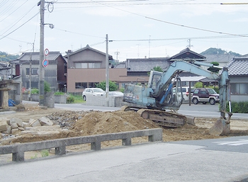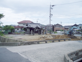 前々から老朽化しました集会場の立て替えは懸案事項でありまして、集会場裏の道路拡張(画像の手前・橋の部分)に伴い立て替え計画が具体化。
