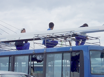 バスの車体の数ヶ所に無造作に掛けられましたビニール製の白いモノ。