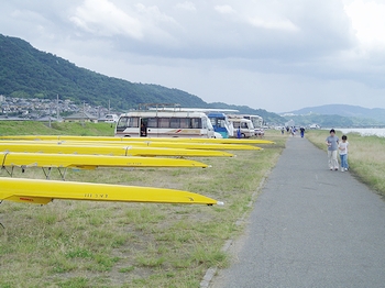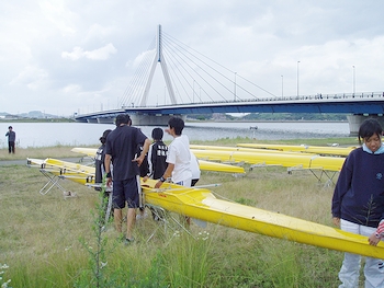 ふ〜ん、随分遠くからヤッて来ておられますから、艇を点検中の皆様に“何の大会?…”と尋ねますと「中国高等学校ボート大会」と実に明快な返答でありました(^_^)v