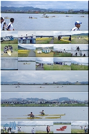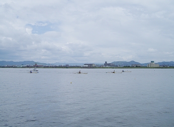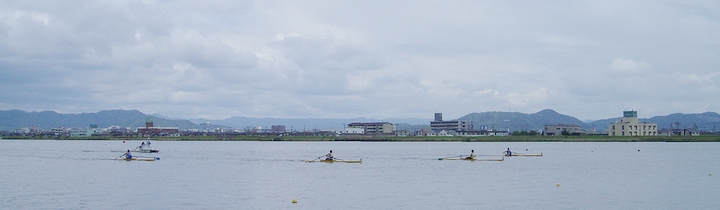 河口堰で堰き止められ人造湖を形成していますから、水質汚染はやむを得ない現状ですけど、いつも豊かな水を蓄え一見キレイに見えます川面です。が、オールで水しぶきを上げられましても決して口には入れないように、くれぐれも気を付けて頂きたいものですよ。
