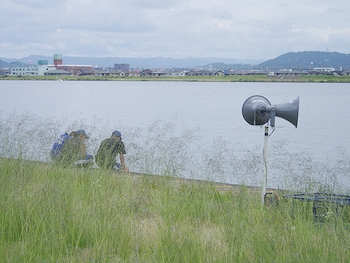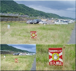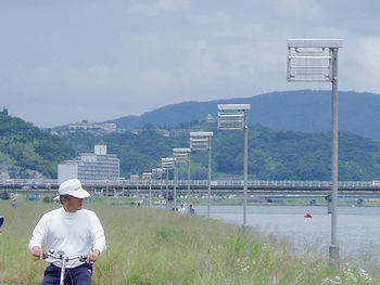 これも6/10(日)の芦田川河川敷で見かけました光景なんですけど、この防虫灯(画像上段)は夜には淡い青色に光りまして仲々情緒的。で、結構美しい景観を醸し出すのですよ(^_^)v この防虫灯、国交省芦田川河川事務所sanに言わせますと正確には「電撃殺虫機」と言うらしいですネ(^.-)☆