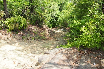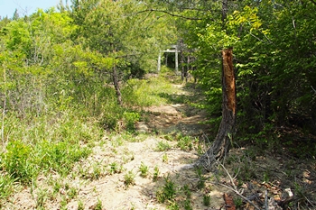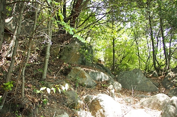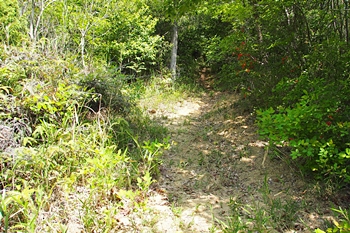 西側の尾根部分に堀切があるらしいので、石鎚神社から降りて行ったが、数段の削平地があることはかろうじてわかるものの、完全に薮となっており降りるだけで精一杯。 しかも堀切を確認するには至らず。