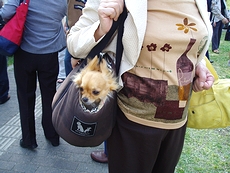 (中)人混みで騒々しいのに、ご主人様に付いて来たかったのでしょうねぇ〜恐る恐る顔を出しておりましたが(^.-)☆
