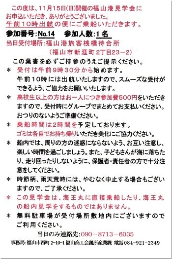 もぅ随分前に「11/15(日)福山港見学会」に応募しておりましたけど、全く忘れておりました。
