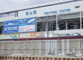 福山城遺構発掘現場での説明会、周辺の景観も撮っておこう…と、JR福山駅方向にカメラを向けまして“んっ?!”と眼が止まりましたのがこの看板(^-^)