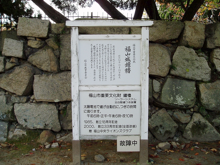 福山市重要文化財の福山城鐘櫓(やぐら)から響く鐘の音が、昨年末から途絶えている。JR福山駅周辺に「時」を告げてきたが、太陽電池で動く自動鐘突き装置は故障したまま。管理する市教委は「予算不足」を理由に放置してきたが、市民から苦情も届き本年度中の修理を決めた。