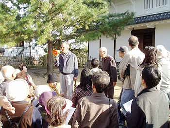 従来なら櫓の中に入りまして説明されますのでしょうけど、あまりにも見学者が多いため伏見櫓の入り口前での説明となりました(^-^)