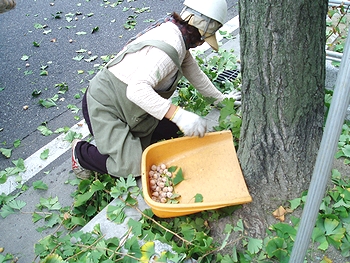 作業中の男性に“あのぉ、銀杏の事でチョッとお願いがあるのですけど…”と話しますと、「あの方に…」と女性の方を指さされます。
