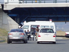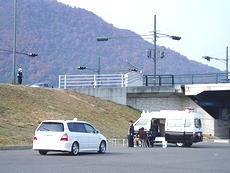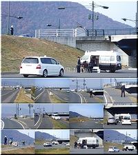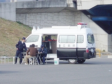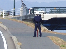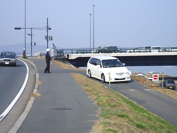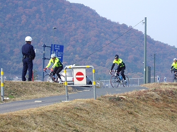 西詰でフラッグを振られて橋の下の河川敷にと誘導されますのですけど、土手から橋下にと降ります際には鉄製の車止めがありますし、少々狭い隙間を通らなければなりませんから、捕まった方々のお顔を拝見しますと、どのお顔もしかめっ面(^_^)