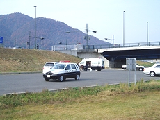 橋を水呑側に渡りきり次のハローズ前の交差点で突然、赤い懐中電灯で合図されまして停止を指示。そしてハローズの駐車場にと誘導ですからタマりません(^-^;