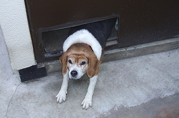 起こしては可哀想と、静かに、ドアの下のワンchan専用口から鼻先と左足の一部をのぞかせて気持ちよさそうに眠っています様子をパチリ(^.-)☆