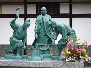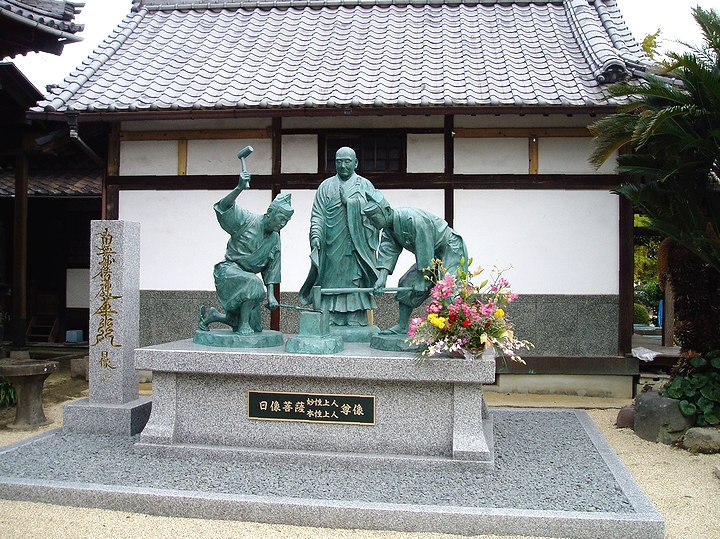 銅像は高さ1.5b、幅2.5b、奥行き1.8b。京都・妙顕寺を開山した日像上人の前で、福山・妙顕寺を創建した一乗兄弟が刀を打つ姿を表現した。檀家の代表が資料を集めて研究を重ね、富山県の業者に制作を依頼。檀家ら約500人の寄付で完成した。