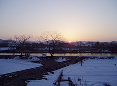正面は“北上川”で、その向こうから朝日が顔を覗かせました(^_^)v