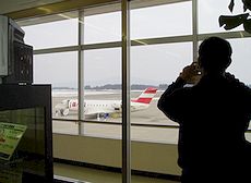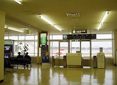 花巻空港ロビーで (中)(右)搭乗手続きを終え、空港待合室で…