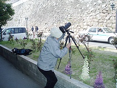 (左)福山城・天守閣です (中)(右)北口からご年配の方が福山城公園のサクラを狙っておられました(^.-)☆