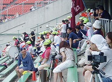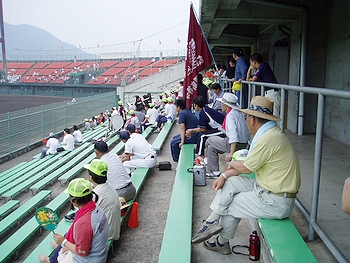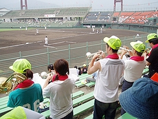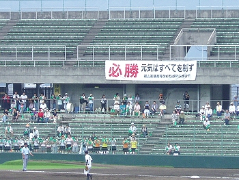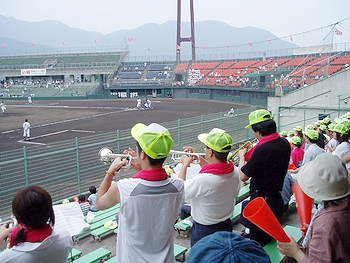 私も高校野球の観戦はチームがどこでありましても好きですから、3連休の初日は早速、福山市民球場での2試合を観戦となりました。暑いとは言いましても、あいにくの曇天で芦田川からの風も流れ比較的涼しい中での野球観戦。時折り覗きます夏の日差しを避けて、私は3塁側のスタンドでの観戦です(^.-)☆第一試合の「葦陽×自彊」戦は、A.M.10:00に試合開始で1×5で葦陽の敗退。第二試合の「市立福山高校×廿日市西」戦は、7回コールドで10×3と市立福山高校の敗退…と、残念ながら今日の地元福山勢は2校とも敗れてしまいましたネ(^-^;ところで、今朝の中国新聞にはこんな記事で、昨日の“市立福山高校”を報じておりました。《高校野球広島大会 吹奏楽部が初の応援》--- 2005/07/17 中国新聞 ---■福山中・高 入部増えて実現福山市赤坂町、市立福山中・高の吹奏楽部が16日、福山市民球場(同市水呑町)であった全国高校野球選手権広島大会に出場した同校野球部の応援に初めて駆け付けた。これまで部員不足で参加出来なかったが今春、中学1年生19人が入部して実現した。一塁側スタンドに吹奏楽部の生徒35人が陣取った。同校の攻撃になると、トランペットやクラリネットで「サウスポー」や「狙い撃ち」など高校野球の定番10曲を演奏。詰め掛けた生徒や保護者ら約350人の応援団を盛り上げ、選手を後押しした。試合は廿日市西高に3×10で7回コールド負け。中学1年の大島百世さん(12)は「負けたのは残念だけど、選手は一生懸命頑張っていた。来年こそは勝って、選手と一緒に校歌を歌いたい」と話していた。…と、こんな記事で(^.-)☆挿入しています画像の下段が市立福山高校の1塁側応援団の光景ですけど、仲々まとまりのイィ応援でありました(^_^)v今朝の中国新聞記事に眼を通しますまで、今回が初めての吹奏楽部応援とは知りませんでしたけど…知っておりましたら、もっと沢山の画像を撮りましたのですけどねぇ〜とにかく、高校球児に取りましては待ちに待った夏の大会です。勝負ですから勝ち負けは仕方ありませんけど、悔いの残らないように全力を出し切って燃焼して頂きたいものですネ(^-^)//"