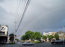 (左)(中)突然夕立で、暫くしますとキレイな虹が(^_^)v (右)甲突川河上方向に鹿児島中央駅の観覧車が…
