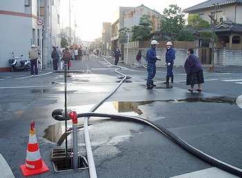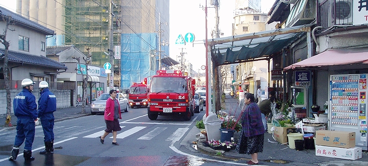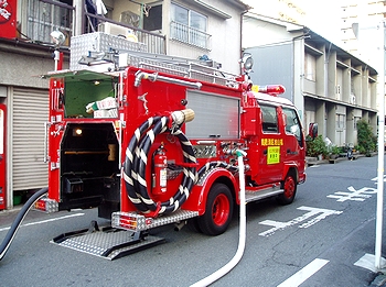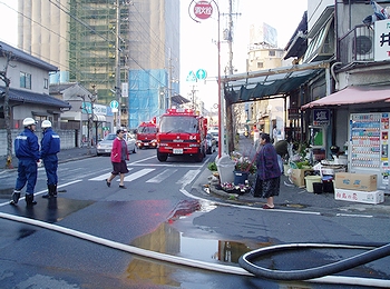 何でも、外出先から職場に戻っています時に消防車に遭遇。で、何処に行くのだろぅ…と眼で追っていますと近くに停車。