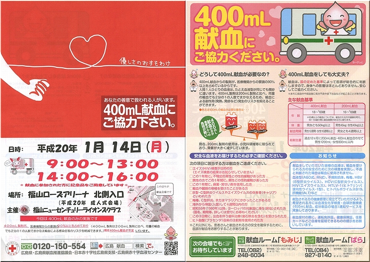 昨日・1/14(月)の成人の日は、職場に置いてありました「あなたの善意で救われる人がいます“400mL献血にご協力下さい”」のチラシに誘われて、福山ローズアリーナ入口で行われています『400mL献血』に、お役に立てれば…との気持ちで出かけて来ました。