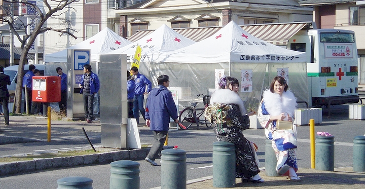 献血は成人式の会場であります「ローズアリーナ」入口で行われていましたから、献血後は新成人の皆様の晴れ姿を拝見して帰る事となりました。