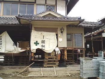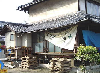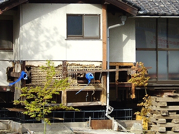 サクソフォンコンサートからの帰路、我が家近くを走行しておりましたら、こんなジャッキアップされました建物が眼に入ってしまいました。んっ、建物全体を移動?! えっ、何をしておられるのでしょう…失礼とは思いながら、チョッと車から降りまして拝見となりました。