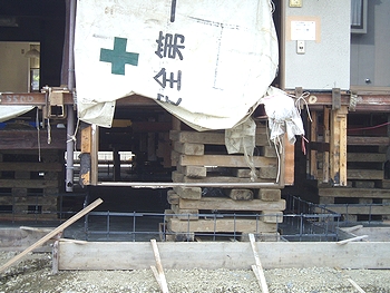 でも、よく見てみますと建物周辺の木々はそのままですから、移動ではありませんで、ジャッキアップし基礎工事?!