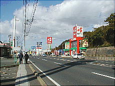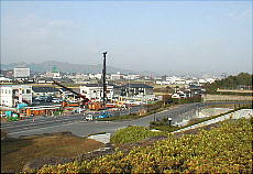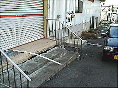 (左)朝、ホテルから勤務先までは、国道沿いをテクテクと歩きでした (中)国道沿いの階段の向こう