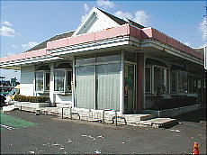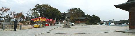 (左)昼食も、こぅしてテクテクと歩きです (中)ここも地盤沈下で廃店のようでした (右)直方駅 近くの“多賀神社”の入口です