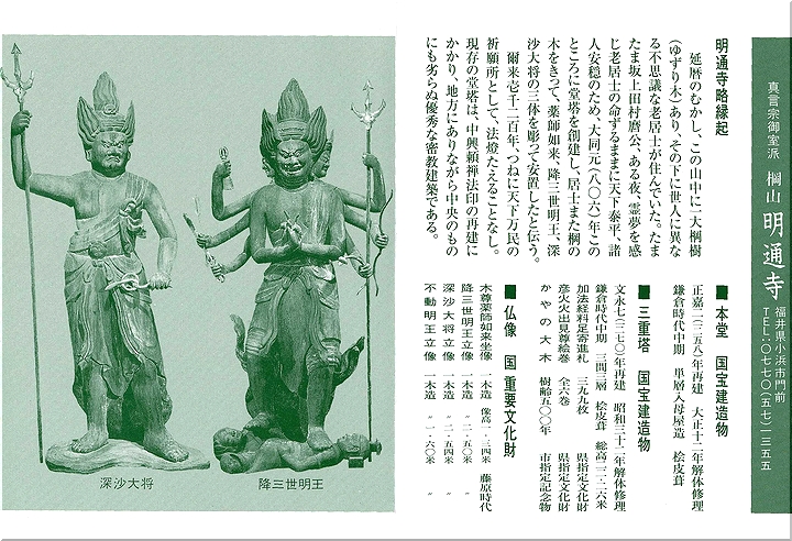 平安後期作の国指定重要文化財、木造降三世明王立像(像高252.4cm)、木造深沙大将立像(像高256.6cm)、木造不動明王立像(像高161.8cm)などを所蔵しています。