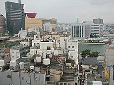 (右)小倉城とリバーウォークの間のお堀りの景観です
