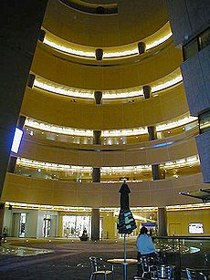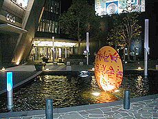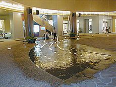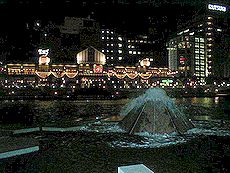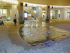 (左)リバーウォークのホールから地階を (中)紫川ほとりの噴
