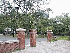 (左)旧第12師団司令部の正門です (中)小倉城天守閣です (右)小倉城の広場から旧第12師団司令部の正門を