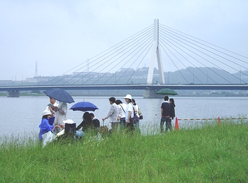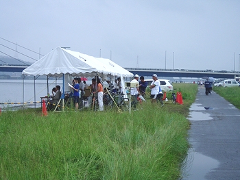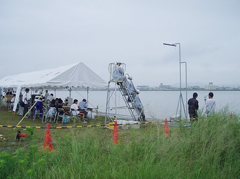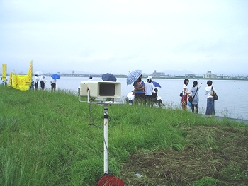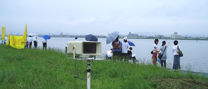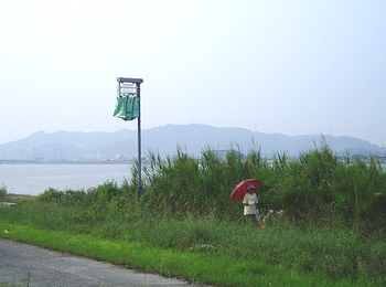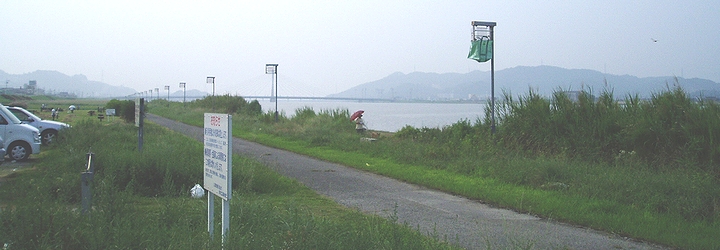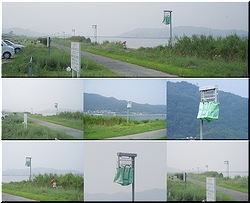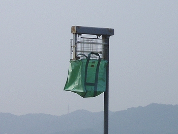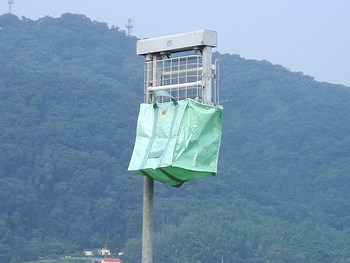 まず、この呼び名から友人に詳細に説明となりました(^-^)“防虫灯”なんぞと言う安っぽい表現をしようものなら「国土交通省福山河川国道事務所」sanから叱られてしまいますから。GONsanのようにこの河川敷をジョギングのホームコースにしている者でしたら、この手提げ袋の役割はいとも簡単に分かってしまいますけど、日頃、河川敷にご縁がありません方々には不思議な存在かも分かりませんネ。もぅ随分前に、こんな中国新聞sanの記事の掲載がありました。《ユスリカに曳航ネット効果》--- 2007/06/19 中国新聞 ---芦田川の河口堰(ぜき)付近を大量のユスリカが飛び交っている問題で、国土交通省福山河川国道事務所が5月末に対策として実施した「曳航(えいこう)ネット」作戦がユスリカの減少に効果を上げていることが18日分かった。同事務所によると、芦田川右岸の観測地点では実施前に比べ、電撃殺虫器に取り付けたかごに入ったユスリカの死体の量が約7割減ったという。来年以降も導入することを決めた。もぅお分かりですよねぇ〜
