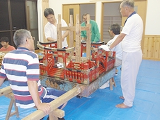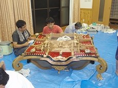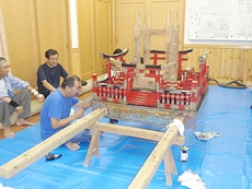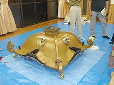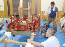 でも、参加率はイィ方かも分かりません(^.-)☆ とは言いましても、毎日欠かさず参加の方も何人かおられますから、2日もサボりましたのが知れたら叱られますかも…こぅしてお集まりの方々の中には、神輿の損傷部分の復元なんぞ朝飯前のプロの方もおられますから、みるみるうちに神輿もキレイになりましたネ。