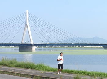 田んぼから水が流れ出ます際には、田んぼの中の水草も一緒に流れ出ますから、これらの水草が芦田川河口堰にと辿り着きまして、それで帯状の芝生のような景観を作り出すのでしょうか…永年、芦田川河川敷でジョギングしておりまして、激しい降雨がありました何日後にはこぅした景観に出会いますから、GONsanは勝手にそぅ思っているだけなんですが…
