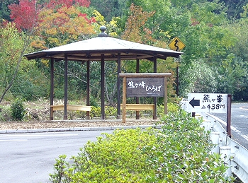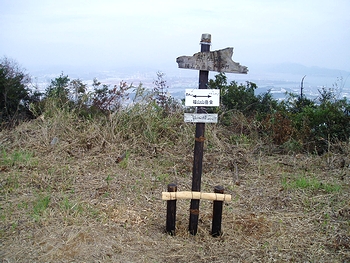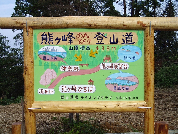 そして、天気も良くなりましたし、熊ヶ峰山頂からの眺望を楽しみたい気持ちに駆られまして、早速、試合観戦は中断し出かけて来る事に致しました。《熊ケ峰、市民憩いの場に 福山》--- 2005/10/20 中国新聞 ---福山市南部を走る広島県道後山公園洗谷線(グリーンライン)沿いの熊ケ峰(四三八メートル)で、地元の特定非営利活動法人(NPO法人)とライオンズクラブが、二年余りかけて整備を進めてきた登山道や展望台が完成した。かつては暴走族のたまり場だった一帯が、憩いの場によみがえった。同市瀬戸町のグリーンライン入り口から南に約三キロ。熊ケ峰の登山道駐車場(熊野町)が再整備され、山頂に至る急な斜面には登山道約三百メートルができた。舗装した駐車場の一角にあずまやが建ち、登山道にはベンチもある。約千平方メートルを整地した頂上には高さ約一・五メートルの木製展望台。笠岡市から尾道市まで瀬戸内海の絶景が望める。整備に当たったのは、NPO法人「グリーンラインを愛する会」(丸山孝志理事長)。会の活動に地元の福山葦陽ライオンズクラブ(岩瀬典博会長)も賛同、協力した。両団体が「熊ヶ峰ひろば」と名付けた駐車場はかつて、暴走行為や施設破壊、不法投棄が相次ぎ、県が長年にわたり封鎖してきた。「何とか市民の憩える場に再生したい」。愛する会などが再整備に着手したのは、二〇〇三年七月だった。当初は、駐車場だけの再整備を計画。その工事は今年六月に終わった。しかし、両団体の関係者から「ついでに頂上まで整備しよう」との声が上がった。登山道と頂上に展望台を設ける作業を続け今月、すべての工事が終わった。約四百万円の費用は、同ライオンズクラブが負担した。駐車場から十五分ほどで登れる山頂。眼下の瀬戸内の大パノラマを前に丸山理事長は「素晴らしい眺めを多くの人に楽しんでもらえれば」と達成感をかみしめる。登山道には、ハイキングを楽しむ市民の姿も目立ち始めた。地元山岳会からは別の登山道を清掃する申し出もある。岩瀬会長は「頂上に立ち、郷土の豊かさや未来の光景に思いをめぐらせてもらいたい」と話している。…と、こんな中国新聞sanの記事。洗谷からグリーンラインにと車を走らせますと、テニス場から15〜20分も要さず熊ヶ峰登り口の駐車場にと到着。