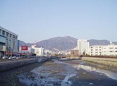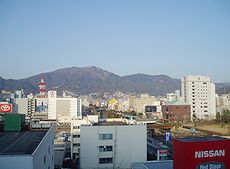 宿泊ホテルから呉市内の景観を 正面が“灰ヶ峰”です (中)呉市内を流れます堺川です