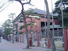 南、入船山公園の一角に位置し、日本瓦寄せ棟の屋根とレンガ色の六角タイルを貼
