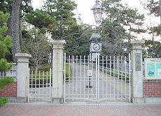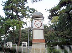 早朝ですから入館は出来ませんが、入船山記念館入口です (右)旧呉海軍工廠塔時計です
