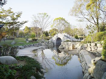 公園の中の市民広場(4.7ha)には、世界的な彫刻家・豊福知徳氏の作で公園のシンボルである大噴水「愛の泉」が設置されています。