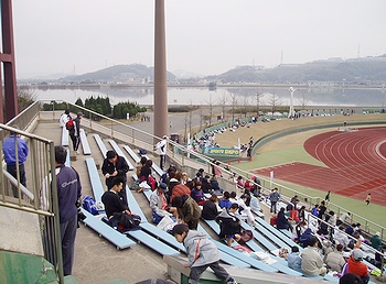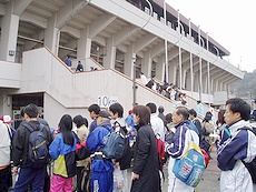 受付後、ゼッケン・記念品・参加者名簿を貰いますと競技場のスタンドへ。