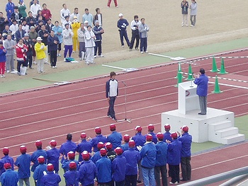 (左)まだ受付手続きをしておられます方も(^.-)☆ (右)前年のハーフマラソン優勝者による選手宣誓です(^_^)v