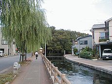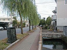 (左) (中)桜川の“水辺の文学碑”です 三島ゆかりの文学者8名の碑が並んでいます (右)桜川です
